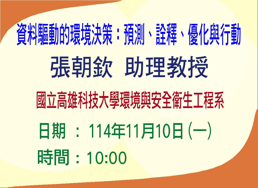 114年11月10日(一)10-12點 國立高雄科技大學環境與安全衛生工程系 張朝欽助理教授 發佈日期:2025-11-10 瀏覽人次:28 友善列印 展開社群分享 分享到臉書 分享到X 分享給LINE好友 您的瀏覽器不支援JavaScript語法,如需列印網頁內容,請使用鍵盤Ctrl+P即可列印;如需將內容分享到各社群平台網站上,請點選連結進行分享:分享到臉書、分享到Google+、分享到推特 回前一頁 此段 JavaScript 提供回上一頁功能,若瀏覽器不支援 JavaScript,請使用鍵盤 Backspace 或瀏覽器回上一頁功能