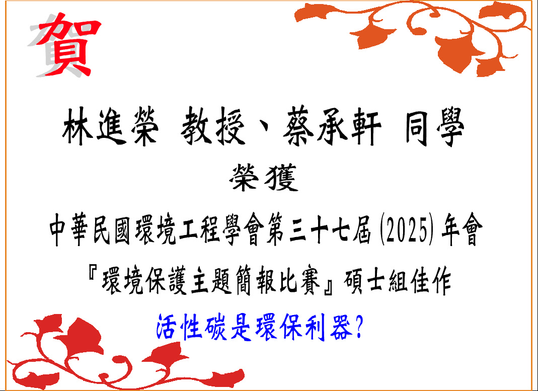 林進榮教授及蔡承軒同學榮獲中華民國環境工程學會第三十七屆(2025)年會環境保護主題簡報比賽碩士組佳作 發佈日期:2025-11-25 瀏覽人次:32 友善列印 展開社群分享 分享到臉書 分享到X 分享給LINE好友 您的瀏覽器不支援JavaScript語法,如需列印網頁內容,請使用鍵盤Ctrl+P即可列印;如需將內容分享到各社群平台網站上,請點選連結進行分享:分享到臉書、分享到Google+、分享到推特 回前一頁 此段 JavaScript 提供回上一頁功能,若瀏覽器不支援 JavaScript,請使用鍵盤 Backspace 或瀏覽器回上一頁功能