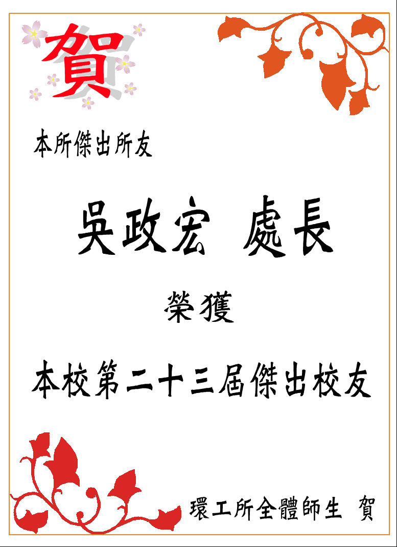 恭賀本所傑出所友 吳政宏處長 榮獲本校第二十三屆傑出校友 發佈日期:2026-03-23 瀏覽人次:26 友善列印 展開社群分享 分享到臉書 分享到X 分享給LINE好友 您的瀏覽器不支援JavaScript語法,如需列印網頁內容,請使用鍵盤Ctrl+P即可列印;如需將內容分享到各社群平台網站上,請點選連結進行分享:分享到臉書、分享到Google+、分享到推特 回前一頁 此段 JavaScript 提供回上一頁功能,若瀏覽器不支援 JavaScript,請使用鍵盤 Backspace 或瀏覽器回上一頁功能