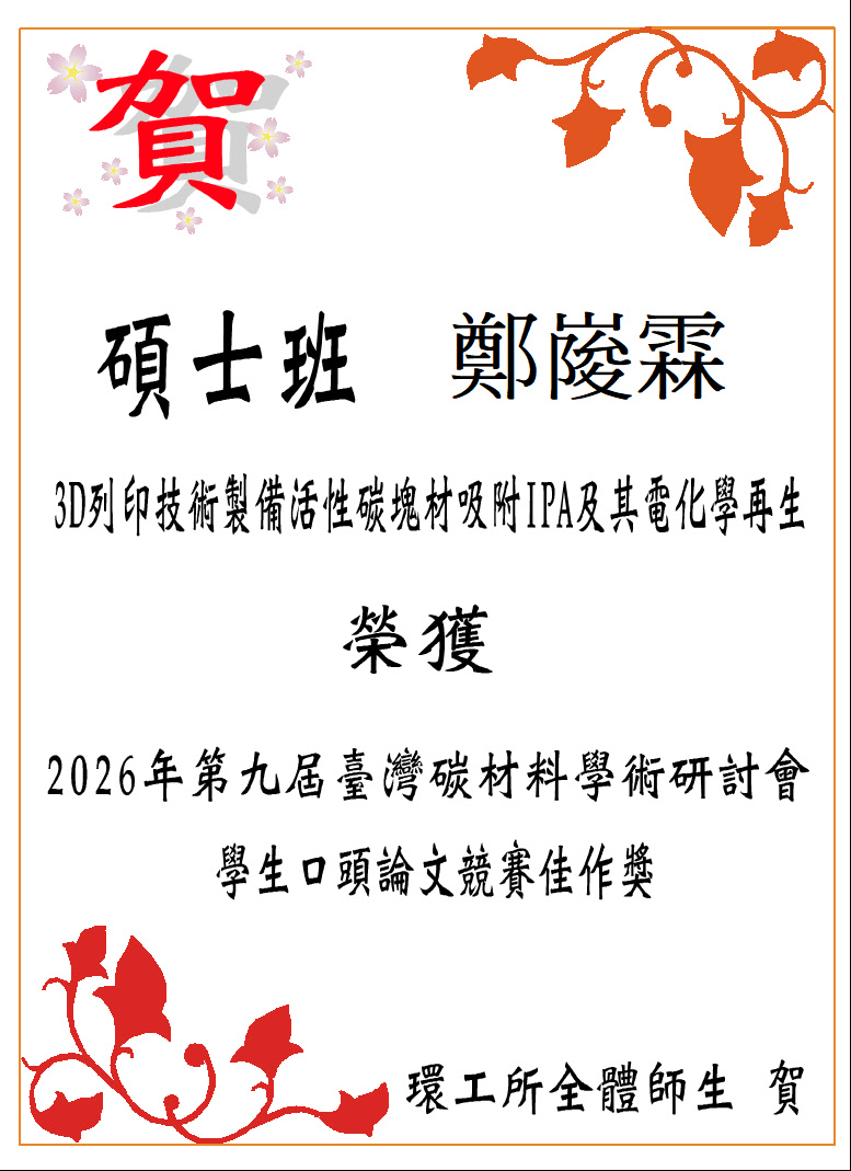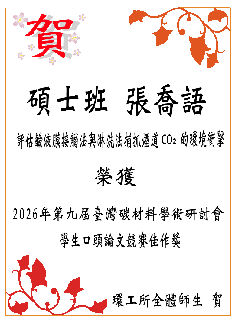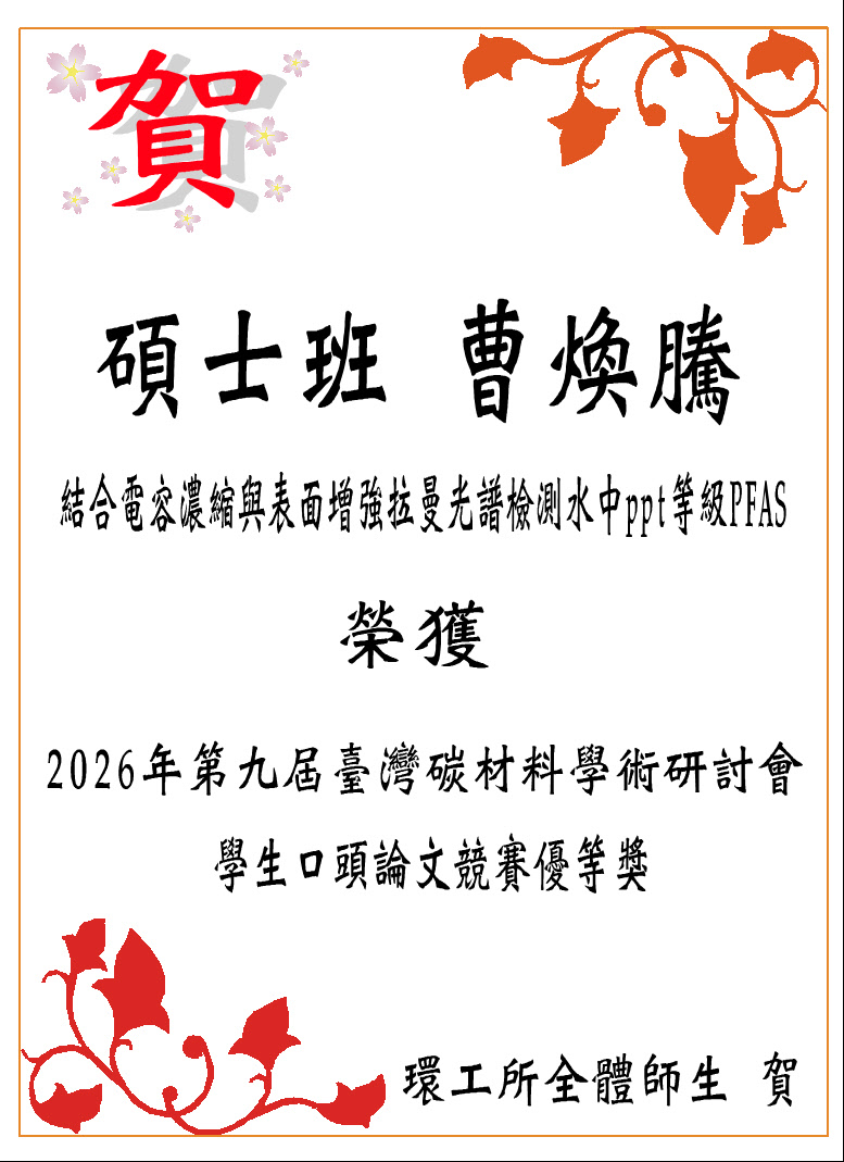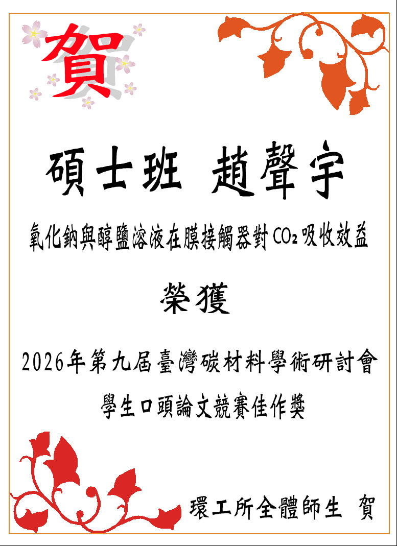 碩士班學生榮獲2026年第九屆臺灣碳材料學術研討會獎項 發佈日期:2026-01-27 瀏覽人次:28 友善列印 展開社群分享 分享到臉書 分享到X 分享給LINE好友 您的瀏覽器不支援JavaScript語法,如需列印網頁內容,請使用鍵盤Ctrl+P即可列印;如需將內容分享到各社群平台網站上,請點選連結進行分享:分享到臉書、分享到Google+、分享到推特 回前一頁 此段 JavaScript 提供回上一頁功能,若瀏覽器不支援 JavaScript,請使用鍵盤 Backspace 或瀏覽器回上一頁功能