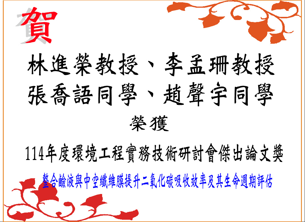 林進榮教授、李孟珊教授、張喬語、趙聲宇榮獲114年度環境工程實務技術研討會傑出論文獎_橫 發佈日期:2025-11-25 瀏覽人次:66 友善列印 展開社群分享 分享到臉書 分享到X 分享給LINE好友 您的瀏覽器不支援JavaScript語法,如需列印網頁內容,請使用鍵盤Ctrl+P即可列印;如需將內容分享到各社群平台網站上,請點選連結進行分享:分享到臉書、分享到Google+、分享到推特 回前一頁 此段 JavaScript 提供回上一頁功能,若瀏覽器不支援 JavaScript,請使用鍵盤 Backspace 或瀏覽器回上一頁功能