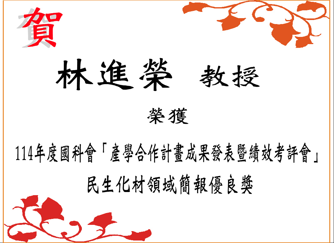 林進榮教授榮獲114年度國科會產學合作計畫成果發表暨績效考評會民生化材領域簡報優良獎 發佈日期:2025-11-27 瀏覽人次:59 友善列印 展開社群分享 分享到臉書 分享到X 分享給LINE好友 您的瀏覽器不支援JavaScript語法,如需列印網頁內容,請使用鍵盤Ctrl+P即可列印;如需將內容分享到各社群平台網站上,請點選連結進行分享:分享到臉書、分享到Google+、分享到推特 回前一頁 此段 JavaScript 提供回上一頁功能,若瀏覽器不支援 JavaScript,請使用鍵盤 Backspace 或瀏覽器回上一頁功能