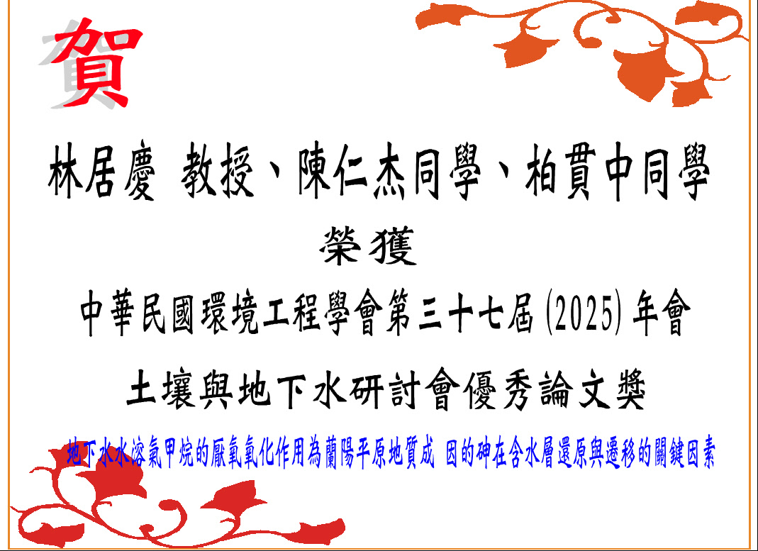 林居慶教授及陳仁杰、柏貫中同學榮獲中華民國環境工程學會第三十七屆(2025)年會土壤與地下水研討會優秀論文獎 發佈日期:2025-11-25 瀏覽人次:31 友善列印 展開社群分享 分享到臉書 分享到X 分享給LINE好友 您的瀏覽器不支援JavaScript語法,如需列印網頁內容,請使用鍵盤Ctrl+P即可列印;如需將內容分享到各社群平台網站上,請點選連結進行分享:分享到臉書、分享到Google+、分享到推特 回前一頁 此段 JavaScript 提供回上一頁功能,若瀏覽器不支援 JavaScript,請使用鍵盤 Backspace 或瀏覽器回上一頁功能