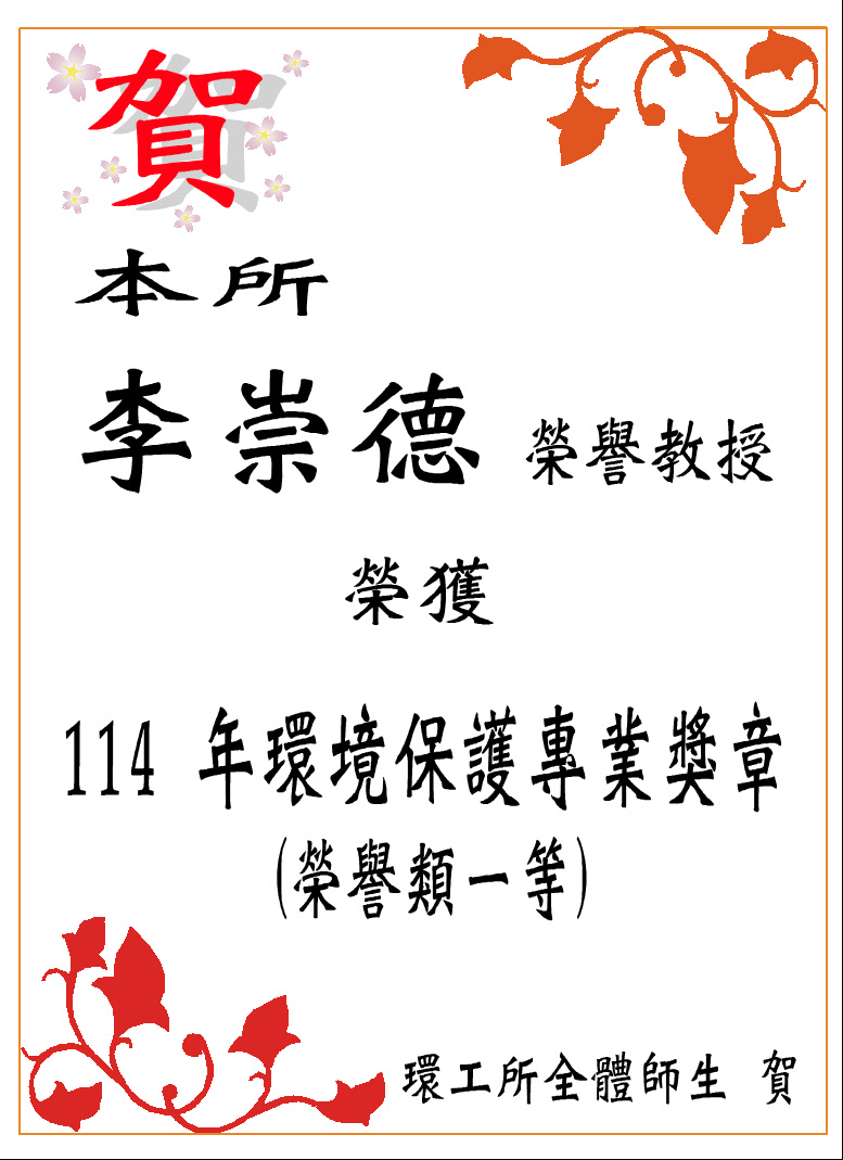 李崇德榮譽教授榮獲114 年環境保護專業獎章(榮譽類一等) 發佈日期:2025-08-26 瀏覽人次:141 友善列印 展開社群分享 分享到臉書 分享到X 分享給LINE好友 您的瀏覽器不支援JavaScript語法,如需列印網頁內容,請使用鍵盤Ctrl+P即可列印;如需將內容分享到各社群平台網站上,請點選連結進行分享:分享到臉書、分享到Google+、分享到推特 回前一頁 此段 JavaScript 提供回上一頁功能,若瀏覽器不支援 JavaScript,請使用鍵盤 Backspace 或瀏覽器回上一頁功能