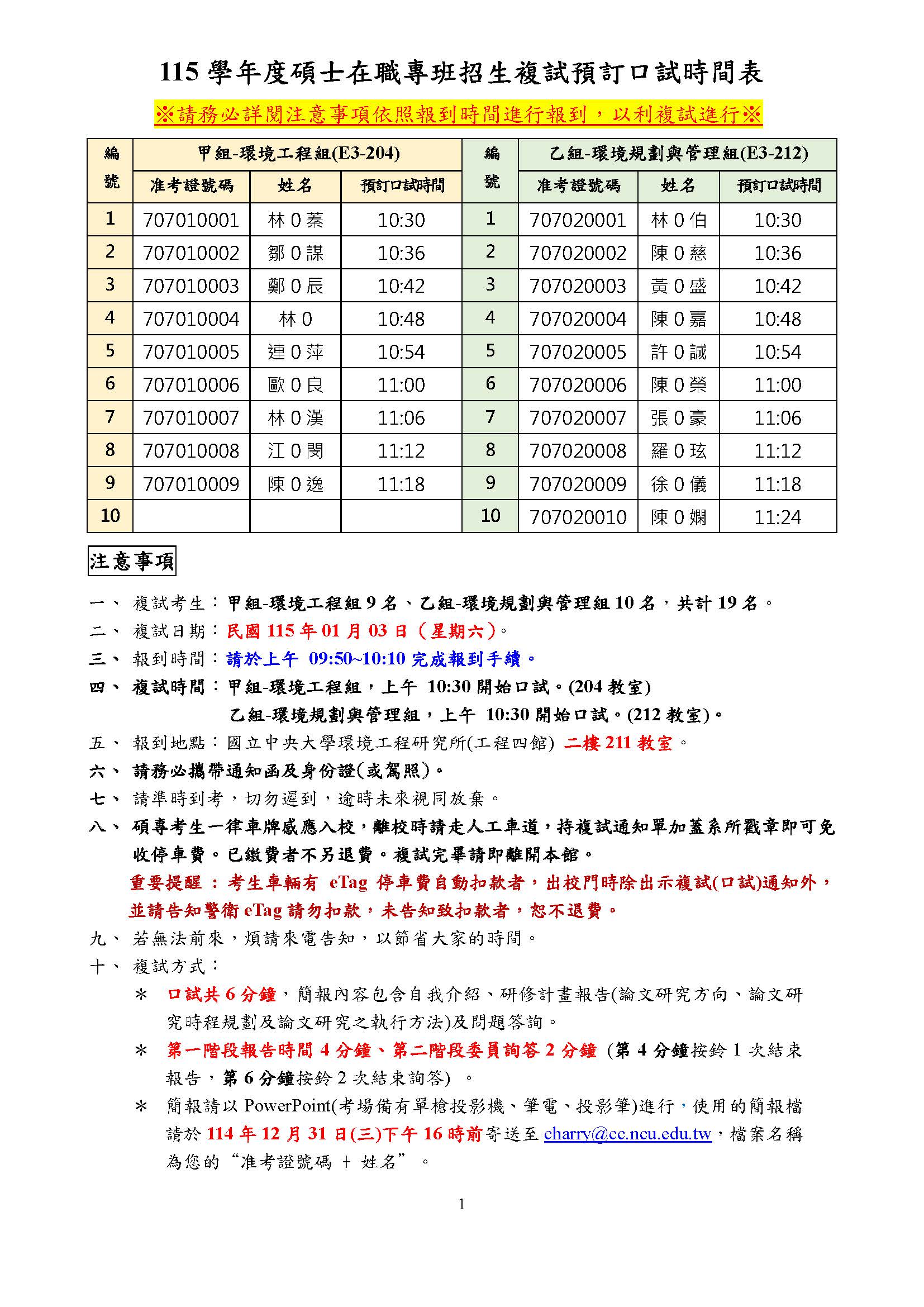 11 5 學年度碩士在職專班招生複試公告 發佈日期:2025-12-26 瀏覽人次:24 友善列印 展開社群分享 分享到臉書 分享到X 分享給LINE好友 您的瀏覽器不支援JavaScript語法,如需列印網頁內容,請使用鍵盤Ctrl+P即可列印;如需將內容分享到各社群平台網站上,請點選連結進行分享:分享到臉書、分享到Google+、分享到推特 附加檔案PDF115碩專班-複試口試順序與說明(網頁版).pdf更新日期:2025-12-26 09:16檔案大小:150.63 KB 回前一頁 此段 JavaScript 提供回上一頁功能,若瀏覽器不支援 JavaScript,請使用鍵盤 Backspace 或瀏覽器回上一頁功能