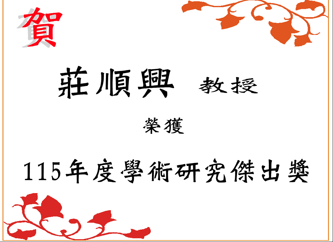 莊順興教授榮獲115年度學術研究傑出獎 發佈日期:2025-12-31 瀏覽人次:21 友善列印 展開社群分享 分享到臉書 分享到X 分享給LINE好友 您的瀏覽器不支援JavaScript語法,如需列印網頁內容,請使用鍵盤Ctrl+P即可列印;如需將內容分享到各社群平台網站上,請點選連結進行分享:分享到臉書、分享到Google+、分享到推特 回前一頁 此段 JavaScript 提供回上一頁功能,若瀏覽器不支援 JavaScript,請使用鍵盤 Backspace 或瀏覽器回上一頁功能