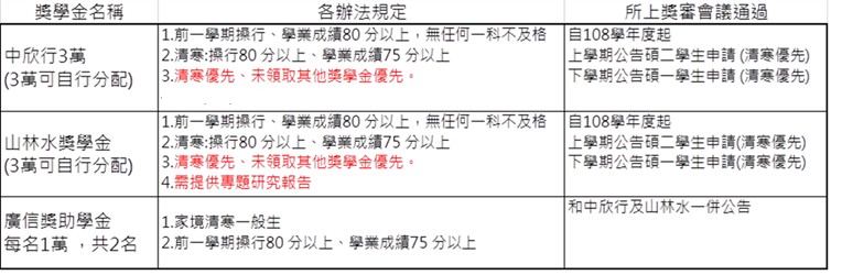 <公告>114.2中欣行獎學金、山林水獎學金及廣信獎助學金申請至9月25日(四)中午12時止 發佈日期:2025-09-16 瀏覽人次:101 友善列印 展開社群分享 分享到臉書 分享到X 分享給LINE好友 您的瀏覽器不支援JavaScript語法,如需列印網頁內容,請使用鍵盤Ctrl+P即可列印;如需將內容分享到各社群平台網站上,請點選連結進行分享:分享到臉書、分享到Google+、分享到推特 各位碩二同學好, 有關114學年度第1學期,「中欣行獎學金、山林水獎學金及廣信獎助學金」辦法詳如附件,申請期間即日起至9月25日(四)中午12時止,請將申請資料填妥送所辦,俾利開會審議後送出。 ★家境清寒者優先(須提供證明),謝謝大家~ 回前一頁 此段 JavaScript 提供回上一頁功能,若瀏覽器不支援 JavaScript,請使用鍵盤 Backspace 或瀏覽器回上一頁功能